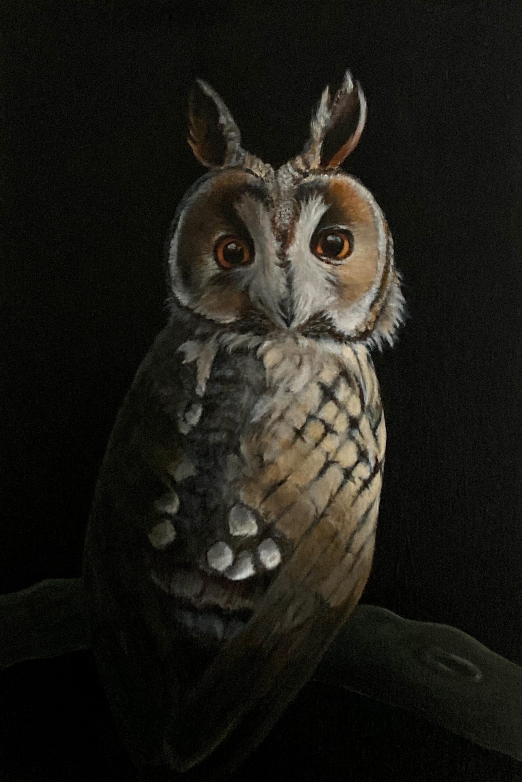 Waldohreule, 2026 Acryl auf Holz, 20 x 30 cm